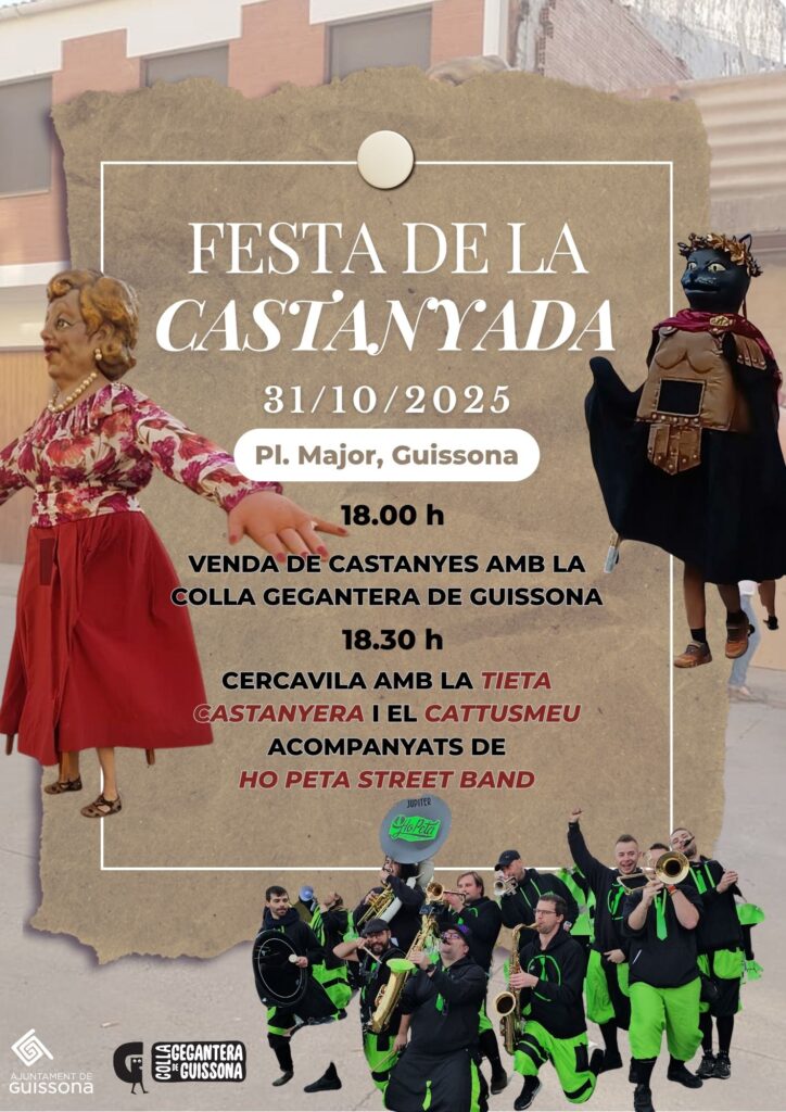 A Guissona t’oferim una combinació fantàstica per a celebrar aquesta tradicional festa. Gaudeix de la cercavila i de les castanyes calentes que courà la colla gegantera local. Al cartell trobaràs tota la informació. T’esperem a Guissona!!