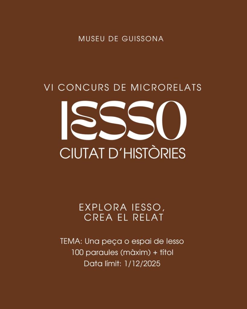 El Museu de Guissona convoca el VI Concurs de Microrelats “Iesso, ciutat d’històries”, obert a majors de 16 anys.Els textos, de màxim 100 paraules, han d’inspirar-se en objectes o espais del Museu.Es poden enviar fins a l’1 de desembre a museu@guissona.cat —amb premis de fins a 200 € Bases: https://drive.google.com/file/d/1_NYjRceXxoNWuhtSNapSSh1X9uQh2epV/view Més informació: https://museudeguissona.cat/iesso-ciutat-dhistories-el-concurs-de-microrelats-del-museu-de-guissona/