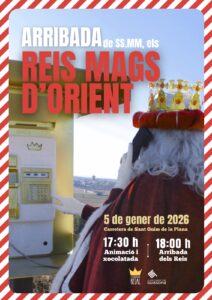CAVALCADA DE REIS A GUISSONA 5 DE GENER Carretera de Sant Guim de la Plana 17.30h Animació i xocolatada 18h Arribada dels Reis + Afegir a Google Calendar Exportació a + iCal / Outlook Data 05 01 2026 Caducat! Hora 17:30 - 19:30 Comparteix aquest esdeveniment