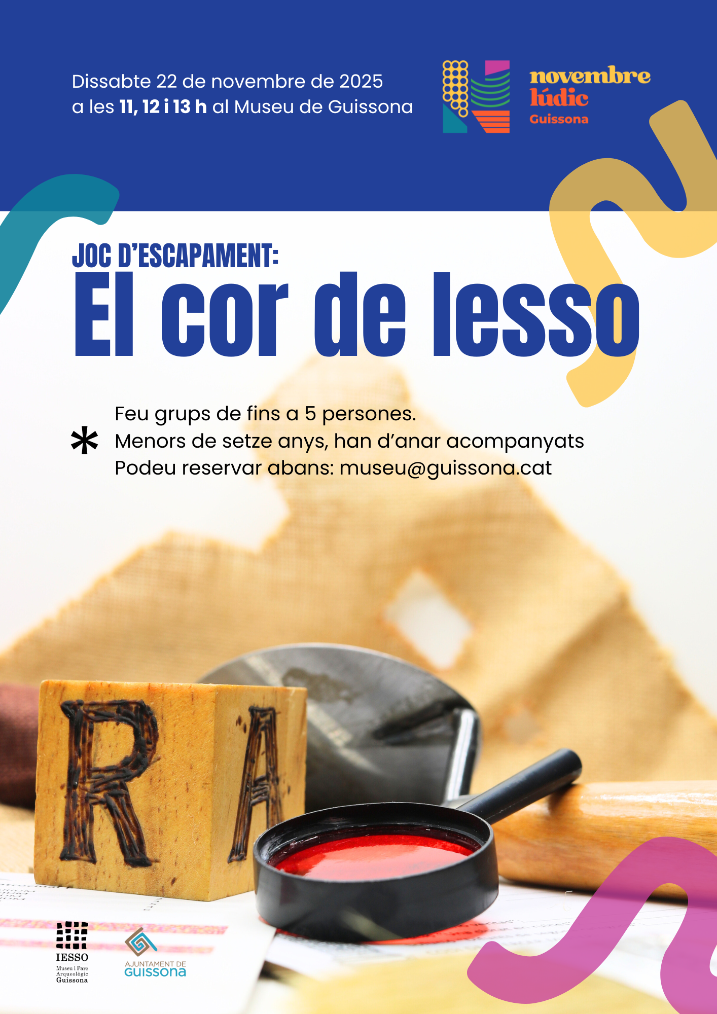 JOC D’ESCAPAMENT: EL COR DE IESSO + Add to Google Calendar + iCal / Outlook export 00 days 00 hours 00 minutes 00 seconds Date nov. 22 2025 Time 11:00 - 14:00 Location Museu de Guissona Category cultura infants joventut novembre lúdic Organizer Museu de Guissona. Parc Arqueològic de Iesso Phone 973551414 Email museu@guissona.cat Website https://museudeguissona.cat/inici/ Share this event