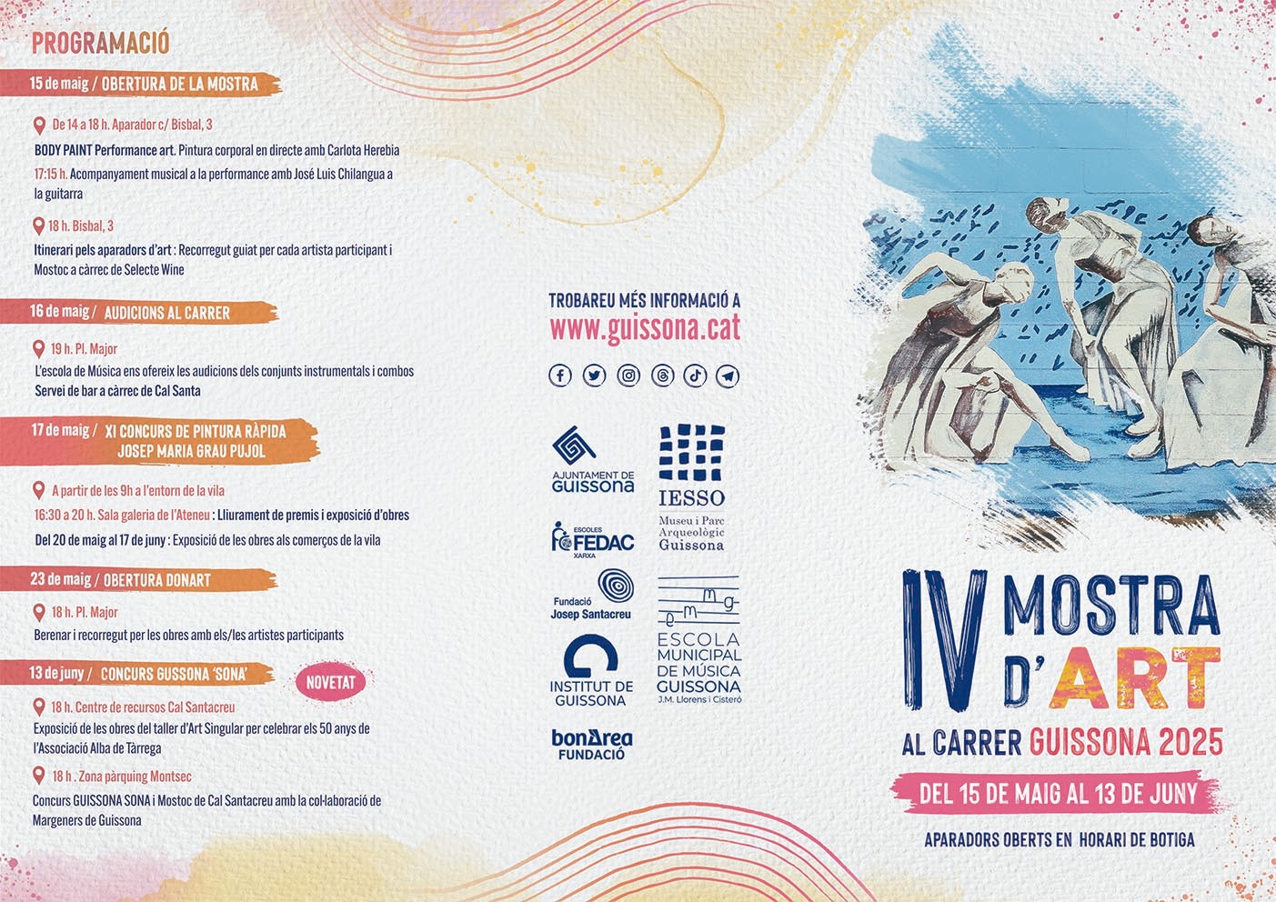 Per completar que l’art prengui vida als carrers de Guissona, l’Escola Municipal de Música ens ofereix les audicions dels conjunts instrumentals i combos a la Plaça Major: serà el divendres 16 de maig a les 19h.