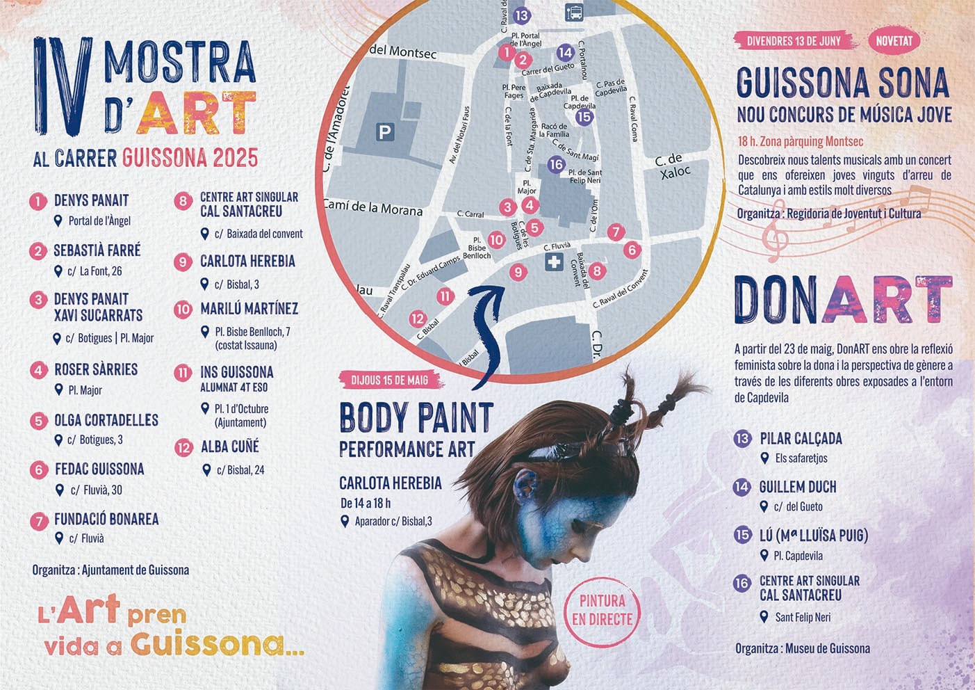 També trobareu intervencions d’entitats locals en alguns carrers i places: FEDAC Guissona, Fundació BonÀrea, Centre Art Singular Cal Santacreu i INS Guissona.