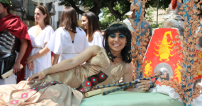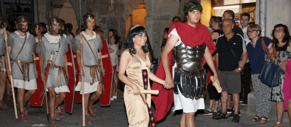 Entre els patricis i els plebeus, en algun moment del dia, també s’hi barrejaran el Cèsar i la Cleòpatra que acompanyats dels seu seguicis omplen de glamour i color el seu recorregut pel Mercat Romà, un mercat en el que hi trobareu diferents mercaders que ens ofereixen tot tipus de productes d’origen romà.